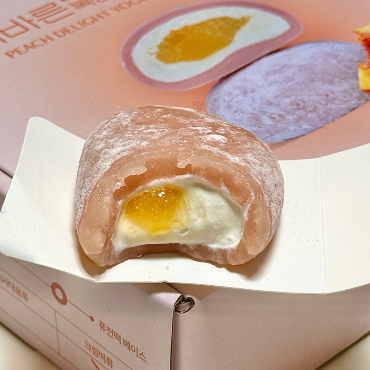 최애픽 크림떡!! 살짝 녹으니까 아이스크림 모찌처럼 말랑하고 부드러워요, 식감이 예술적이에요 상큼달콤한 복숭아요거트 맛이 많이 먹어도 질리지 않을 정도로 맛있었습니다!