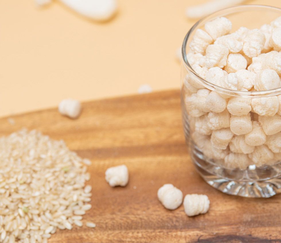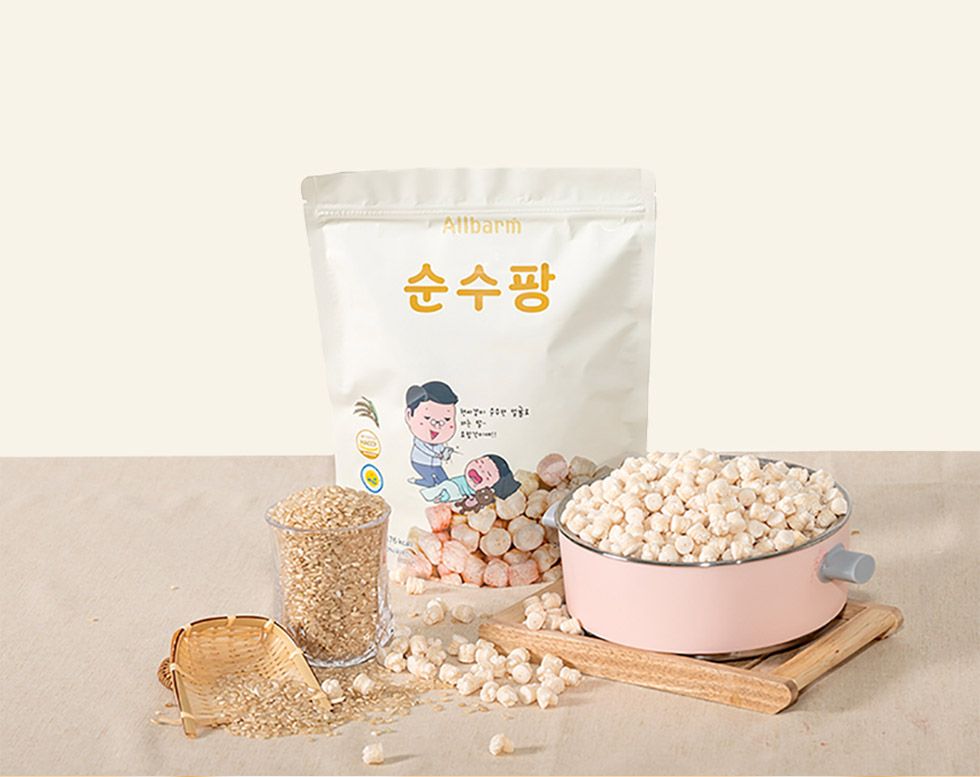 "기름에 튀기지 않고 현미를 열로 팽창시켜 만들었어요. 국내산 유기농 현미 100%에 쌀눈을 더해 더욱 고소하답니다."