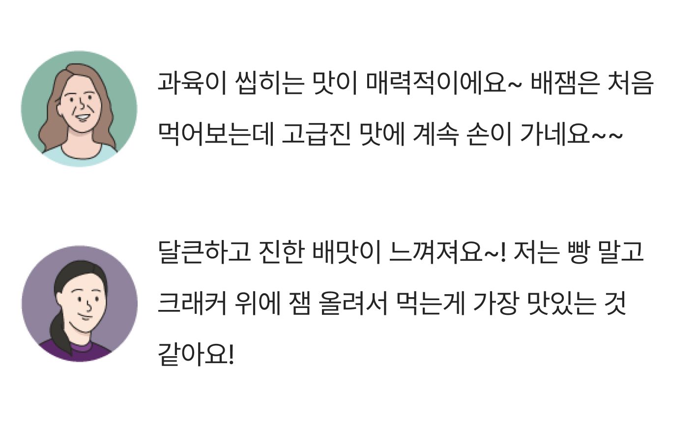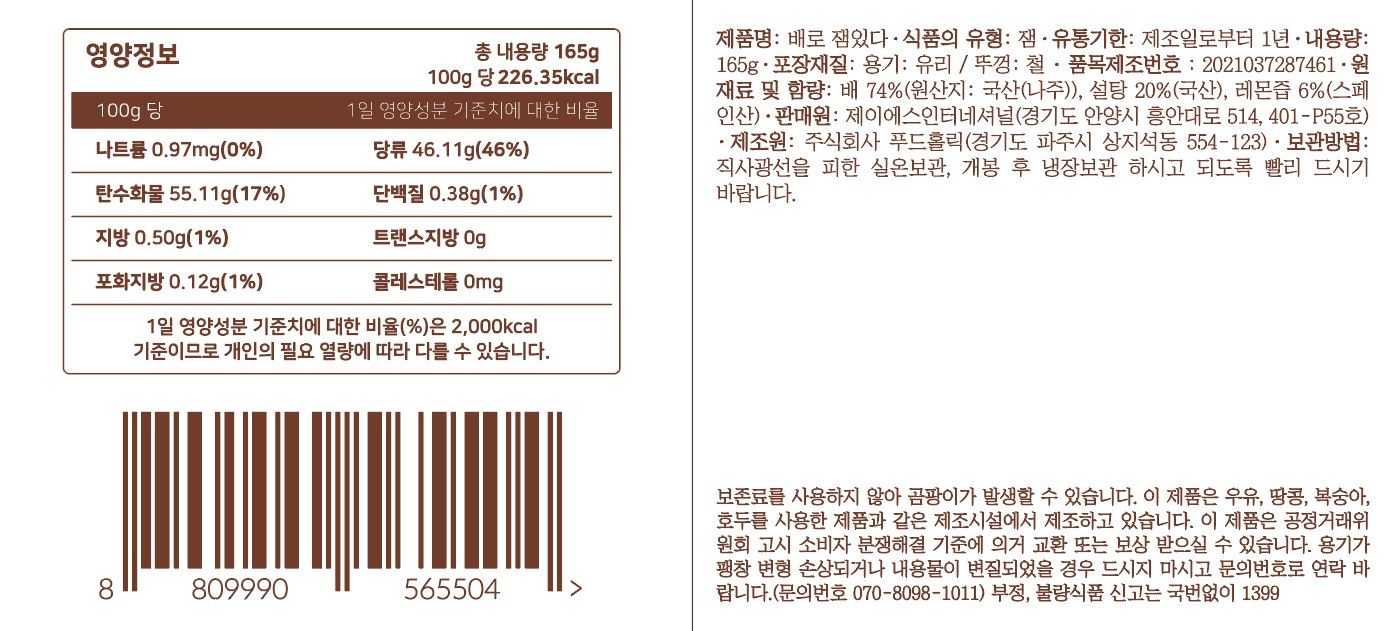 합성 첨가물 없이 오직 원재료만으로 배의 식감과 맛을 재현했어요. 순수 원재료만을 사용하여 신선한 과일 그대로의 맛을 안전하게 즐길 수 있는 배로 잼있다 입니다.