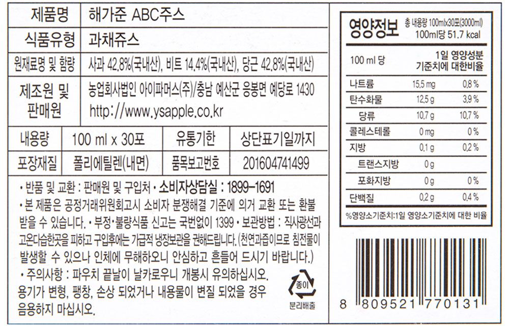 자연 그대로 착즙한 원액으로 영양소 파괴를 최소화하는 NFC 공법으로 착즙해 원물 본연의 맛을 살린 ABC 주스에요. 달지 않아 어른부터 아이까지 맛있게 즐길 수 있는 ABC 주스로 우리 가족의 건강을 챙겨보세요. 無설탕, 無색소, 無첨가물! 국내산 사과, 비트, 당근을 제외한 다른 첨가물은 넣지 않고 만들어 건강함만 담았습니다. 사과의 식이섬유, 비트의 칼륨, 당근의 베타카로틴을 한 포로 간편하게 골고루 섭취하세요. 천연 과즙이 한 포에 담겨있기에 잘 흔들어서 마셔주세요. 보관은 가급적 직사광선과 고온다습한 곳을 피해 냉장보관해주세요.