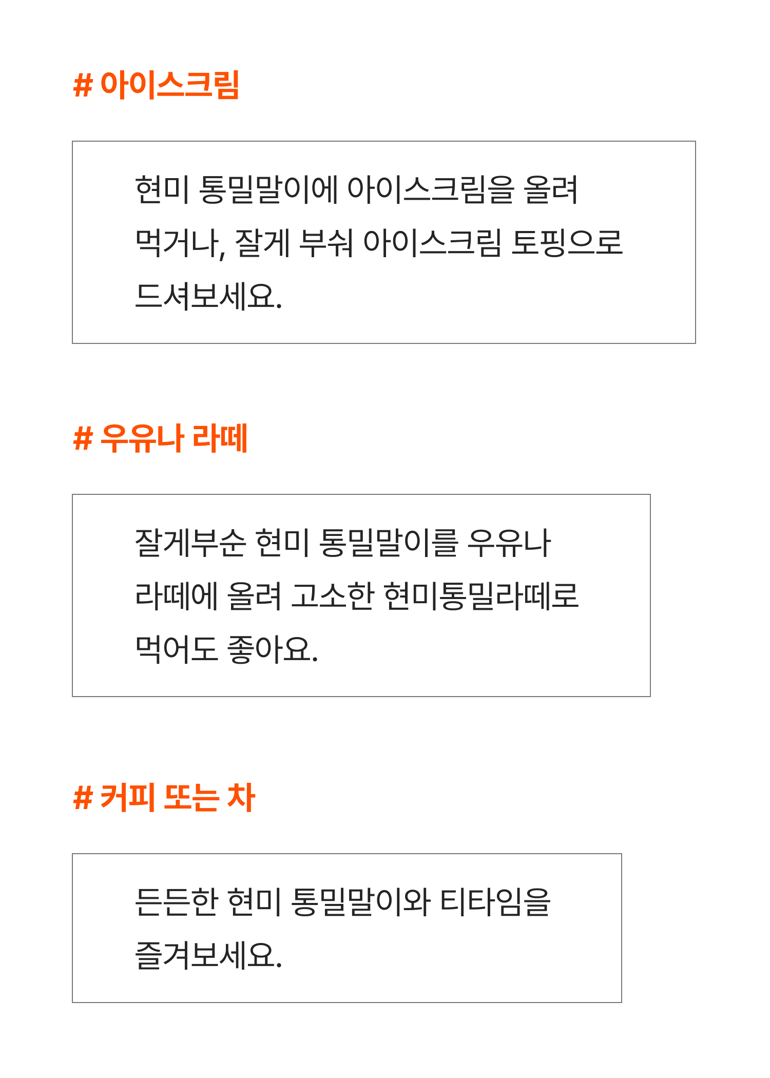 고소하고 은은한 단맛이 좋은 국산 현미를 일정한 압력으로 볶아내어 통밀과 더했어요. 곡류에 해당하는 현미는 복합 탄수화물로 비타민과 무기질, 인, 식이섬유가 풍부하답니다. 또한 편식공장만의 기술력으로 오로지 우리 땅에서 나고 자란 쌀과 보리를 전통 방식으로 고아 낸 조청을 함께 버무렸어요. 순수한 국산 자연 원물이 주는 단맛을 느끼실 수 있으실 거예요. 일정한 압력으로 볶아낸 현미와 통밀은 가볍지만, 든든한 포만감을 느끼실 수 있고, 편안하고 부드럽게 소화됩니다. 우리보리조청으로 당 충전에도 좋아요. 허기짐을 달래줄 때, 간식으로도 좋고, 바쁜 하루에 한 끼 대용으로도 추천해 드려요. 1개당 59kcal의 가벼움으로 부담 없이 드세요!