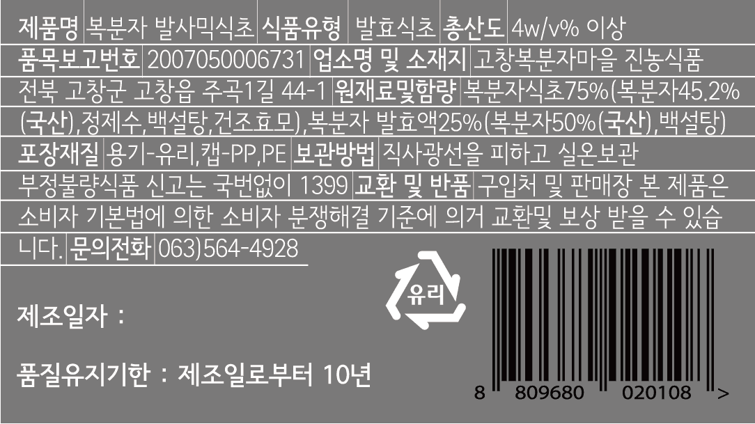 고창군 농식품 명인 최영란 식초 명인이 품질 좋은 고창 복분자로 만든 프리미엄급 복분자 발사믹 식초입니다. 특별 제작된 초항아리를 사용하여 풍미가 깊은 발사믹 식초를 만들고 있어요. 일반 토양보다 미네랄 함량이 21배나 높은 고창의 황토에서 서해안 해풍을 맞고 자라 고창 복분자는 열매가 단단하고 당도가 높습니다. 이처럼 건강하고 믿을 수 있는 고창의 복분자로 만들어 진한 농도와 풍미가 인상깊은 맛을 선사합니다.