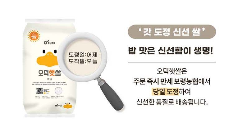 오덕햇쌀은 주문 즉시 만세 보령 농협에서 당일 도정하여 신선한 품질로 배송됩니다. 23년 8~9월에 첫 수확해 신선함이 담겨있는 갓 도정 신선 쌀입니다.
