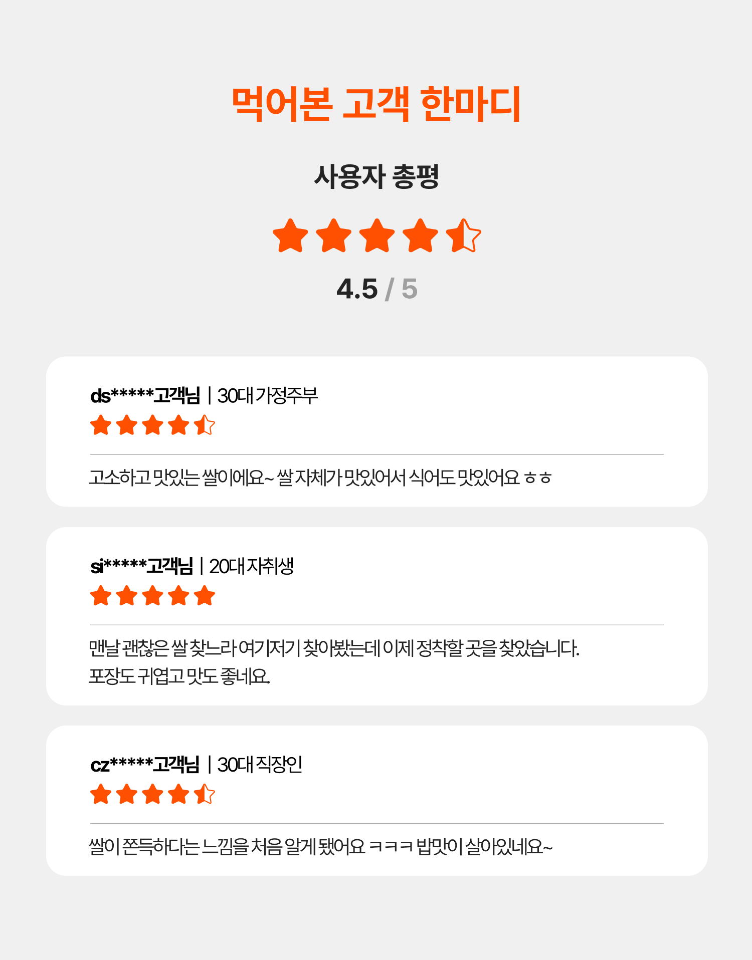완전미 비율 92.4% ‘상’등급 그 이상의 까다롭게 관리하는 고품질 쌀이에요. 등급은 ‘상’이지만 실제 수치는 ‘특’ 등급에 준하는 고품질 쌀입니다. 균일하고 씨알 좋은 쌀알만 엄선한 오덕쌀은 만세보령 농협의 까다로운 관리하에 매일 출하 전 쌀 등급 측정 품질 검사를 실시, 기준 이하의 쌀은 절대 고객에게 판매하지 않습니다.