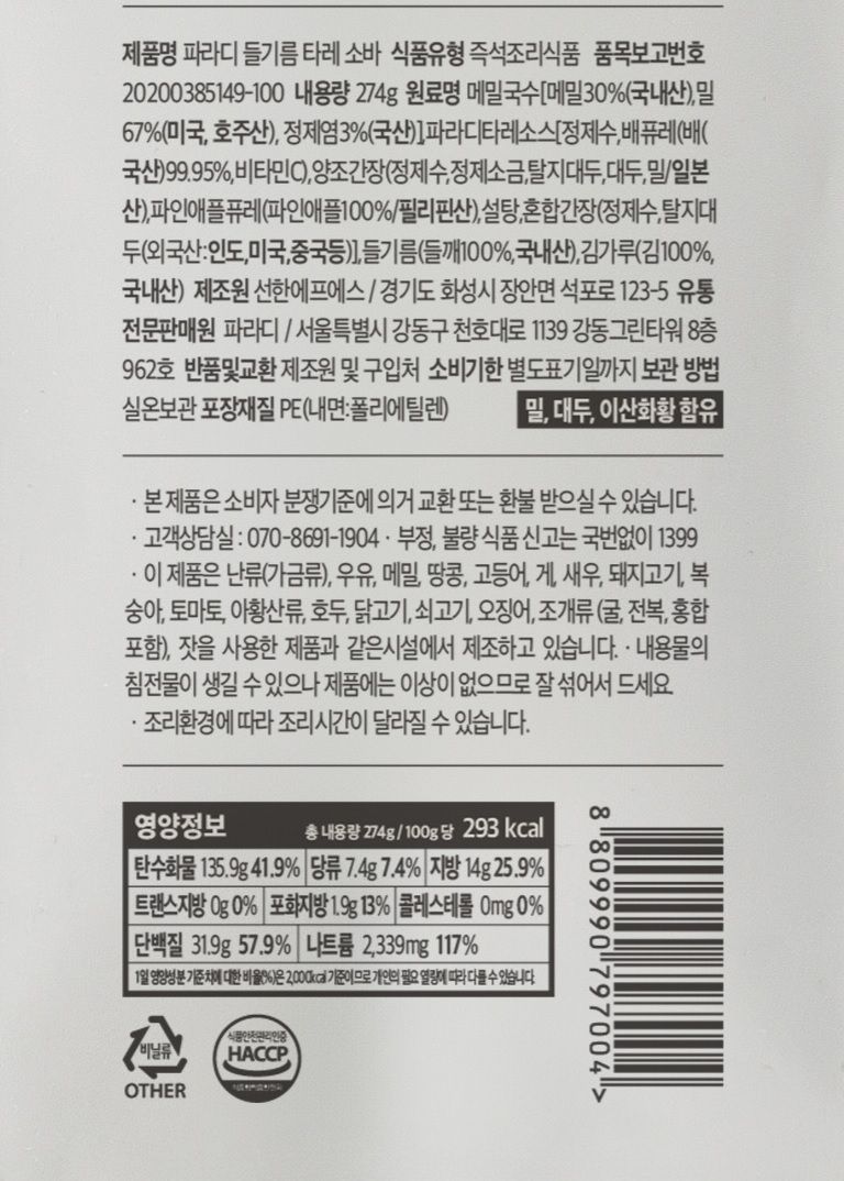 [파라디] 들기름 타레소바 274g 1봉(2인분)ㅣ감칠맛에 계속 생각나는