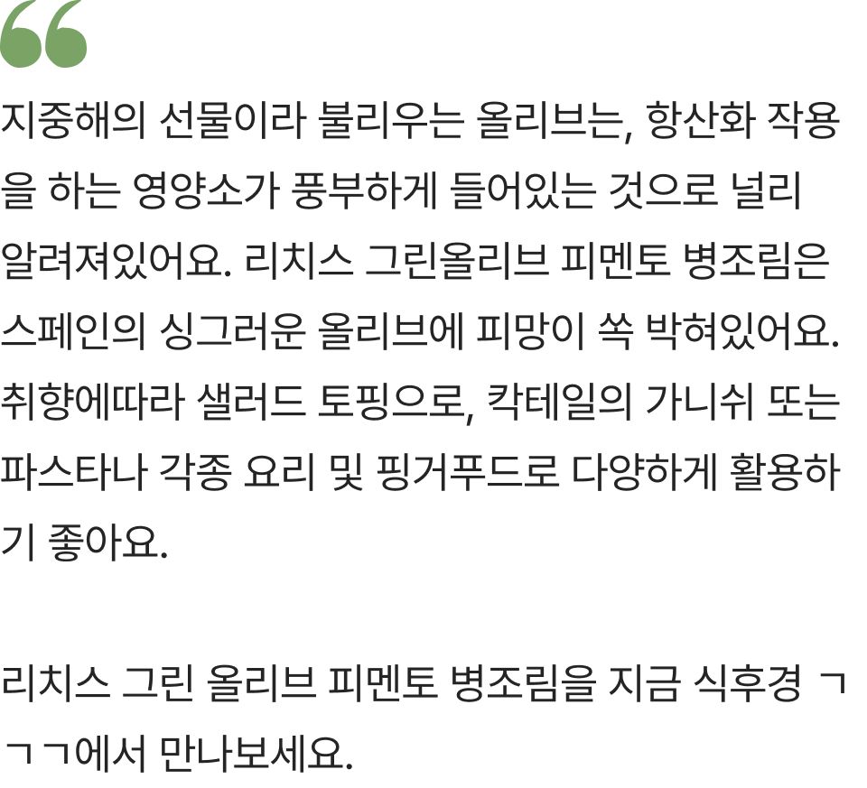 지중해의 선물 올리브, 리치스 그린 올리브 피멘토 병조림 200g