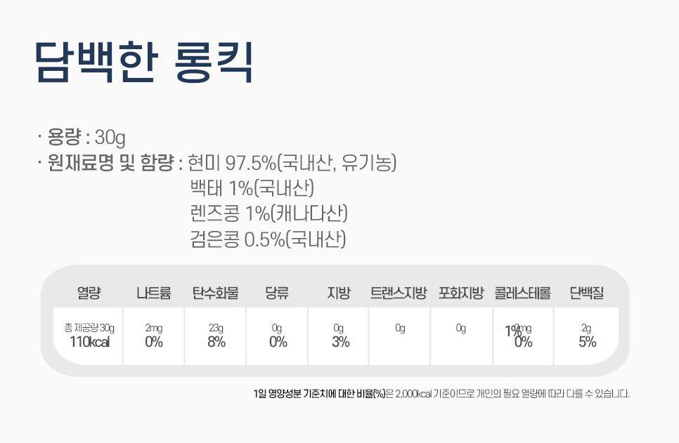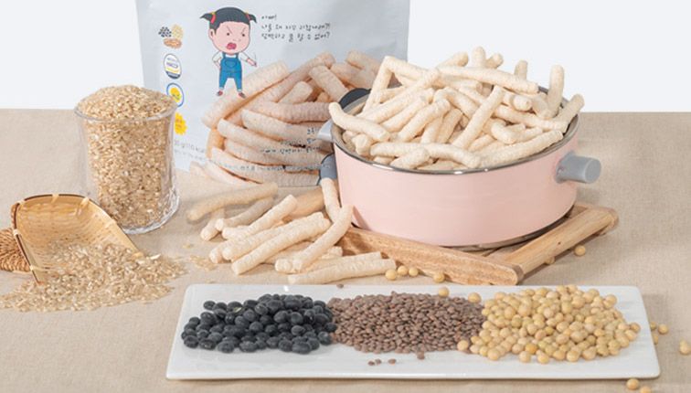 국내산 유기농 현미와 백태, 렌즈콩 검은콩으로 건강하고 맛있는 과자를 만들었어요. 특히 맛 좋기로 유명한 장성에서 난 쌀을 사용해 기름에 튀기지 않고 열로 팽창시켜 만들며, 밀가루나 방부제, 합성착색료 같은 식품 첨가물을 전혀 넣지 않고 원재료만을 사용합니다.