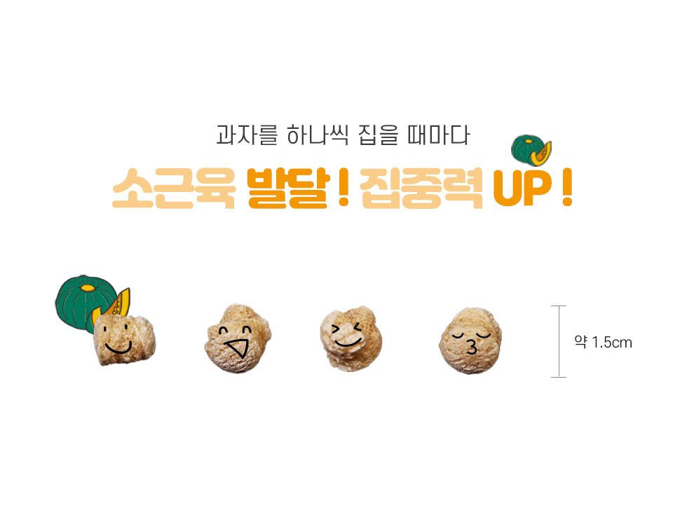 "기름에 튀기지 않고 현미를 열로 팽창시켜 만들었어요. 단호박 분말이 들어가 단호박의 달콤한 맛과 먹음직스러운 노란빛이 더해졌답니다.