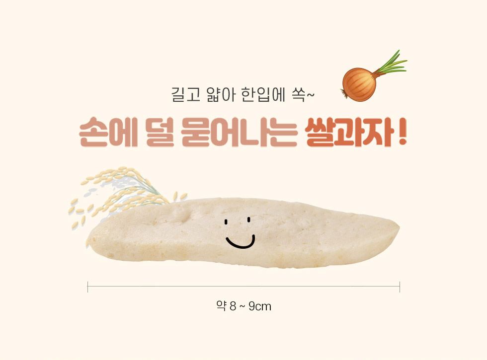 길어서 한 손에 잘 잡히고 손에 덜 묻어나는 쌀과자입니다. 한 손에 쥐고 먹는 시기의 아이들에게 맛 보여주기 좋아요.