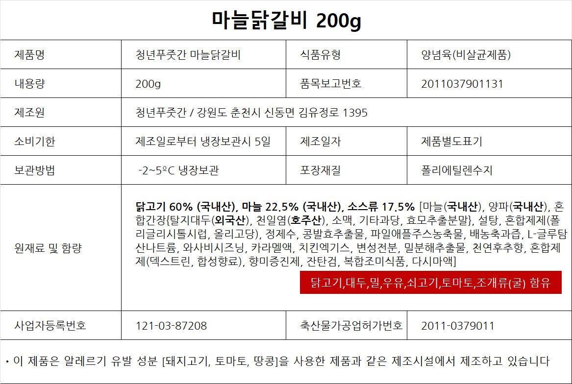 얼리지 않은 국내산 냉장육에 청년푸줏간만의 특제 간장 소스와 국내산 통마늘을 듬뿍 담아 완성한 마늘 닭갈비입니다. 탱글한 닭고기에 입안 가득 퍼지는 달콤하고 알싸한 간장 소스의 완벽 조화를 즐겨보세요. 1인 가구는 한 번에 먹기 좋고, 2~3인 가구는 여러 가지 맛을 다양하게 즐길 수 있도록 200g(약 1인분) 소포장으로 담았어요. 마늘 닭갈비 외에도 오리지널(양념), 간장, 땡초 닭갈비를 취향에 따라 고를 수 있답니다. 가장 신선하고 맛있는 춘천 닭갈비의 맛을 전해드리기 위해 당일 제조, 당일 출고의 원칙을 즐기고 있습니다. 냉동하지 않고 냉장 상태 그대로 보내드리니 집에서 춘천의 맛을 즐겨보세요.