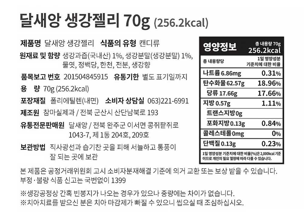 예로부터 봉동 생강은 향이 짙으면서 매운맛은 덜해 임금님께 진상하던 명품 생강으로 유명해요. 100% 봉동 생강으로 만든 생강 즙은 은은하게 퍼지는 생강 향과 살짝 달콤한 맛이 일품이에요. 해초의 일종인 우뭇가사리를 건조 시켜 만든 한천은 식이섬유가 풍부한 식재료에요. 달새앙 생강 젤리는 한천으로 만든 식물성 젤리로 건강하고 맛있게 즐길 수 있는 건강 젤리입니다.