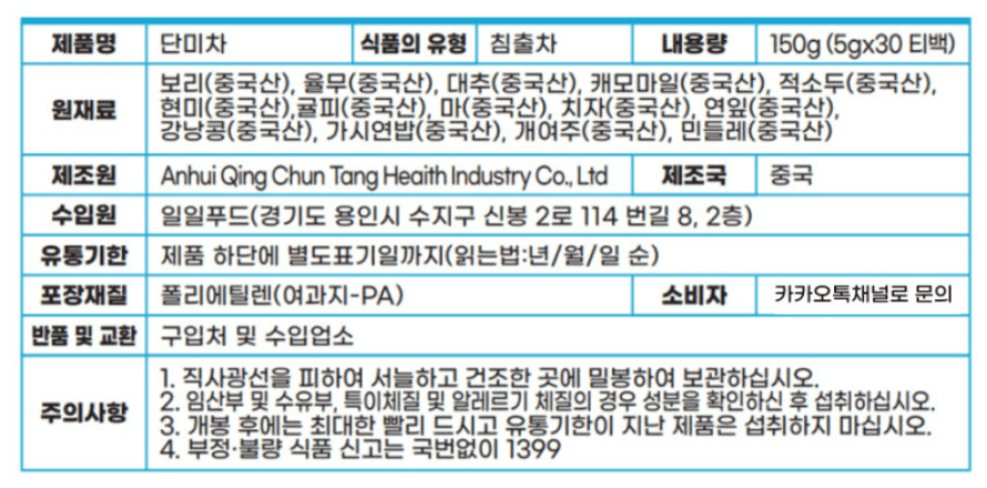 차갑게 뜨겁게 상온으로 개인 취향에 따라 즐길 수 있는 차에요. 대용량 티백으로 하루에 하나만 사용해 계속 우려먹어도 똑같은 맛과 향을 즐길 수 있어요. 단미차로 가벼운 하루를 시작해 보세요.