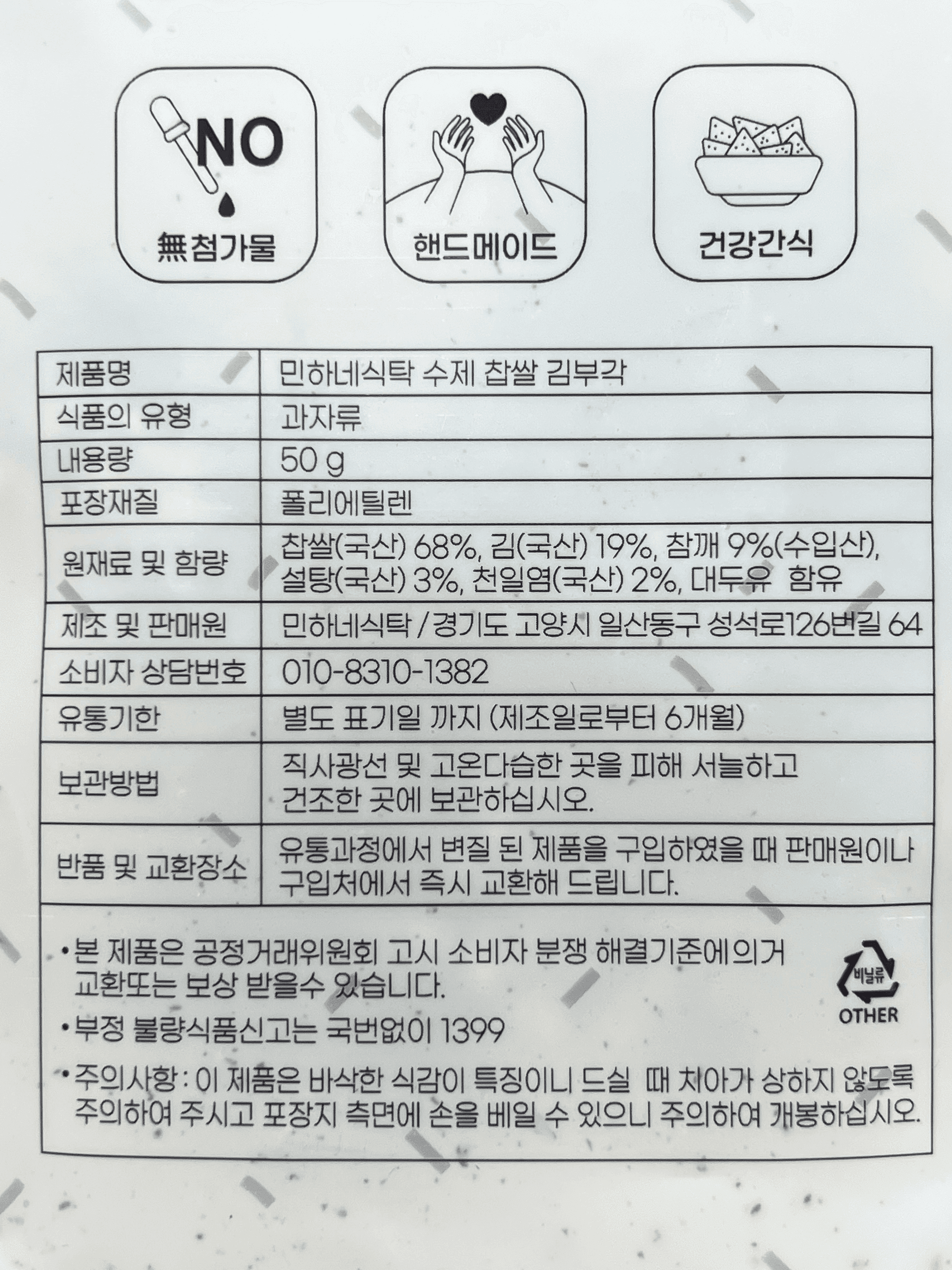 민하네 식탁 찹쌀 김부각은 시간이 걸리더라도 전통 방식으로 한 장 한 장 찹쌀풀을 펴서 바르고 있어요. 김에 진심인 대표님의 뜻에 따라 김은 맛이 가장 좋은 완도산 파래김으로 고집하고 있습니다. 김부각의 풍미와 맛에 영향을 주는 찹쌀, 참깨, 식용유는 직접 보고 최고의 재료만을 엄선하여 만들고 있습니다. 눅눅함은 이제 걱정마세요. 김부각의 특성을 고려한 개별 지퍼백 포장으로 바삭한 김부각을 즐겨보세요.