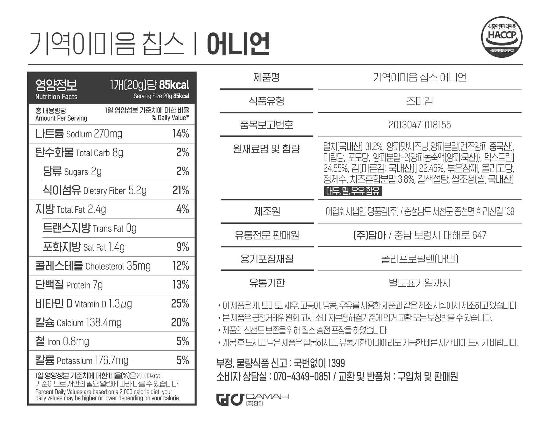 어니언칩스 : 담백한 치즈와 멸치가 더해진 달콤한 양파맛