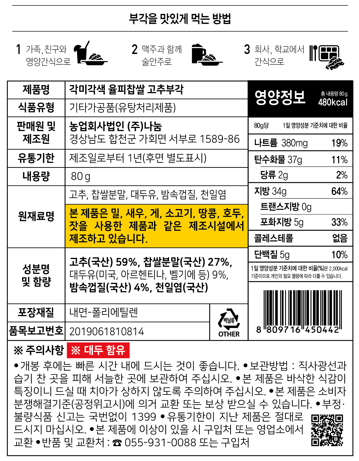 단 1%의 첨가물 없이 만든 원물 고유의 맛 율피찹쌀 나눔 고추부각 1봉 80g