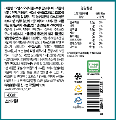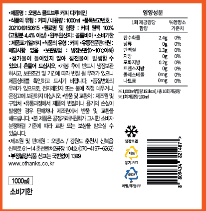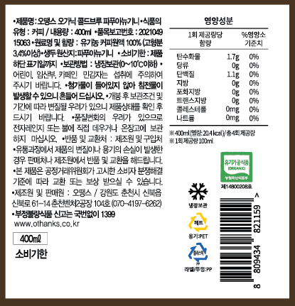 차가운 물 또는 저온에서 장시간 우린 커피를 콜드브루라고 하죠. 오땡스 콜드브루는 원두 가루 위에 물을 한 방울씩 떨어뜨려 장시간 동안 커피 성분을 추출하는 점적식 추출 방식으로 추출해 만들고 있습니다. 티백 커피를 우려내듯 원두 가루와 물을 한꺼번에 담가놓고 우려내는 침출식에 비해 맛이 진하고 풍미와 향이 살아 있는 것이 특징이에요. 유기농 원두로 첨가물 없이 깔끔하게 완성한 콜드브루를 즐겨보세요.